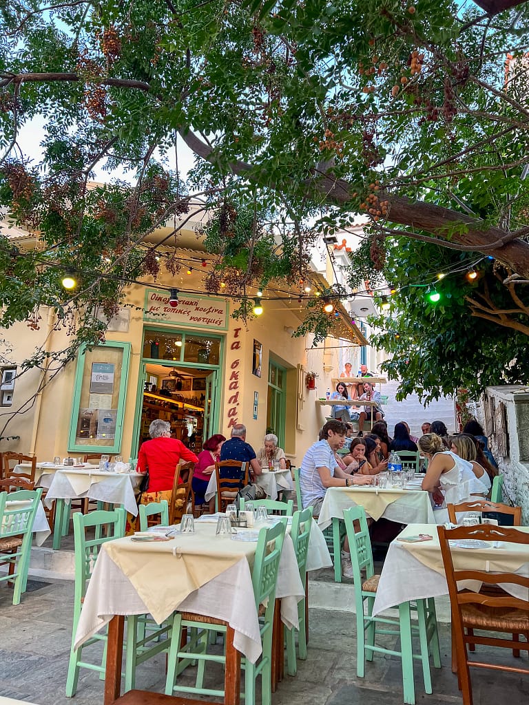 - Unsere beste Mahlzeit in Chora hatten wir im Ta Skalakia, das an einer Treppe in einem Seitenweg direkt an der Fußgängerzone liegt. Das Lokal sieht aus, wie aus einem Reisemagazin. Du musst mindestens einen Tag im Voraus reservieren (+30 2282 022822). Diese familiengeführte Taverne serviert traditionelle griechische Gerichte und kleine Mahlzeiten(Meze) mit beispiellosem griechischem Flair und Gastfreundschaft.