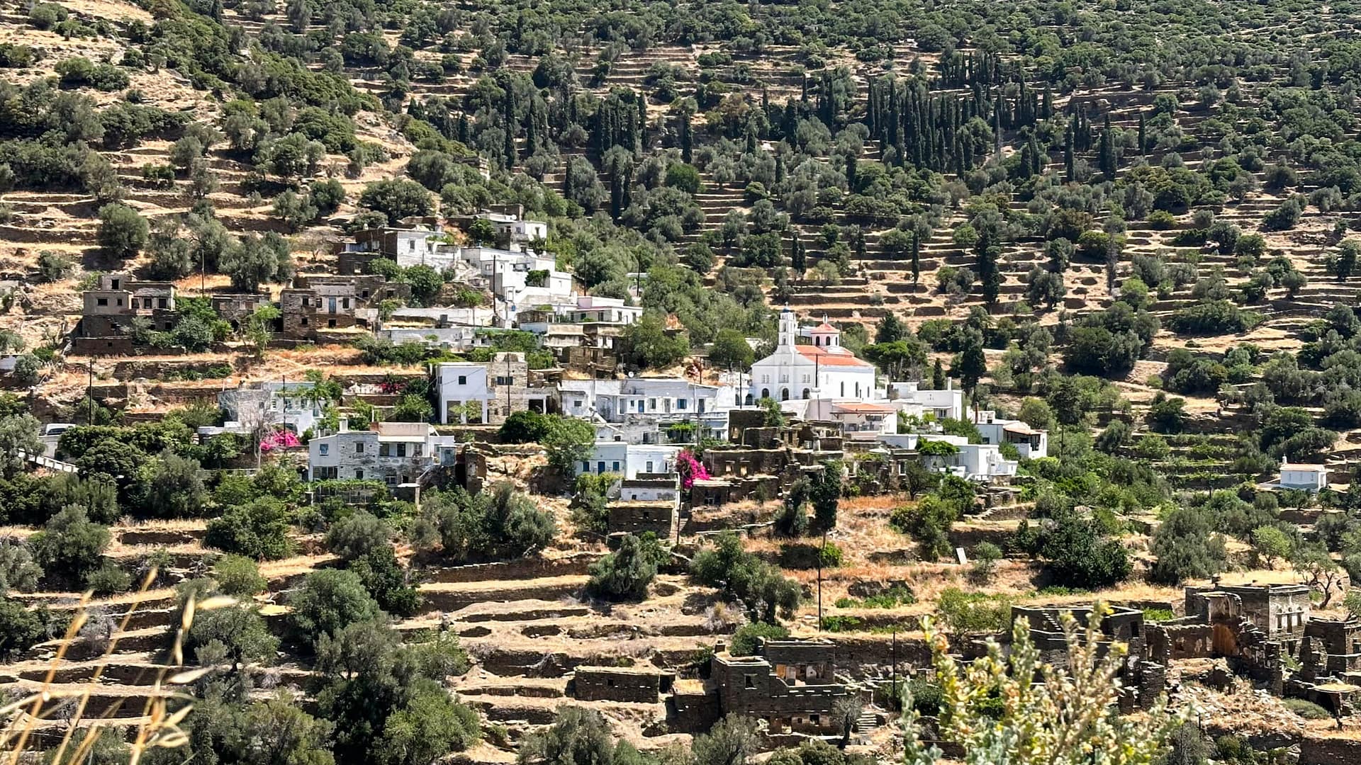 Dieses ländliche Dorf liegt auf einem kleinen Hügel oberhalb von Gavrio. Wir wohnten in der Villa Thimari, einem wunderschön restaurierten ehemaligen Bauernhaus. Hier hat unsere Gastgeberin Sandra uns mit kulinarischen Gerichten, ihrem reichen Wissen und unbeschreiblichem Charme verwöhnt. Lese auch unseren Artikel über unseren unvergesslichen Aufenthalt in der Villa Thimari.