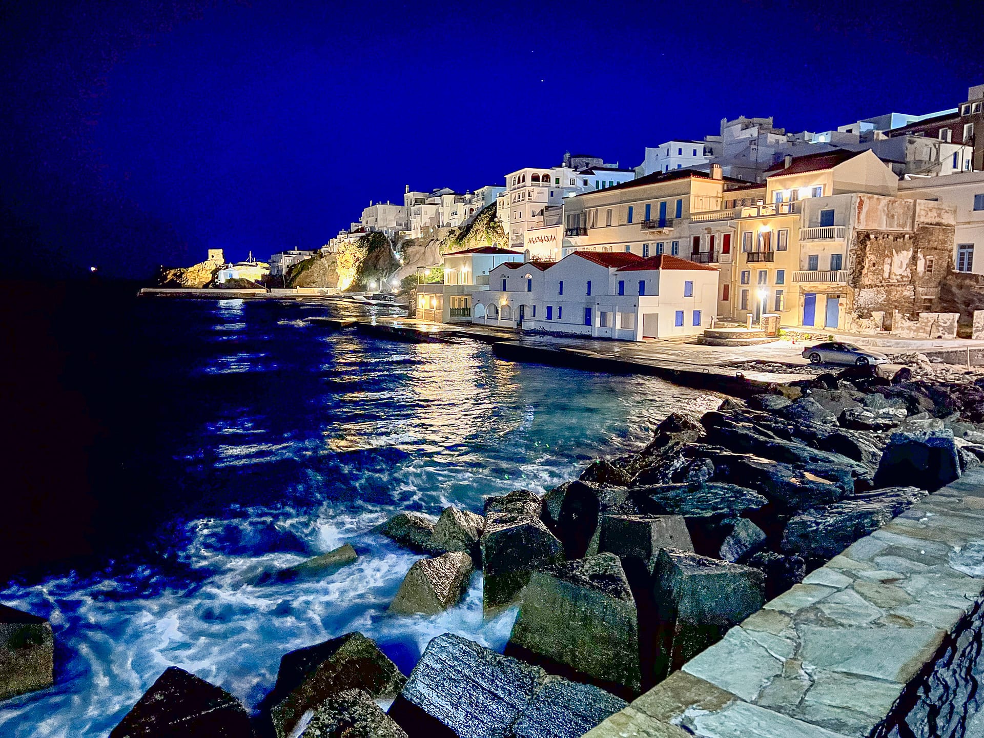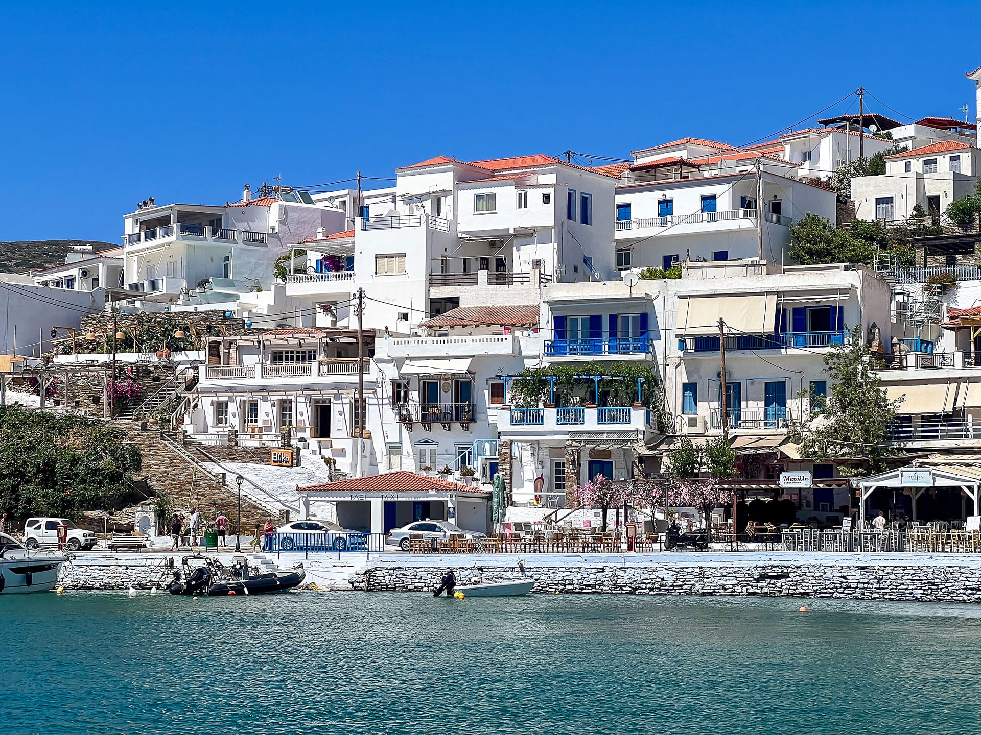 Im Gegensatz dazu haben wir es genossen, im Herzen von Andros zu wohnen und ein Gefühl für die lokale Kultur zu bekommen, das man auf den bekannteren griechischen Inseln oft vermisst. Chora war abends sehr lebendig, wenn sich die Einheimischen mit ihren Freunden und Familien zum Abendessen im Stadtzentrum versammelten.