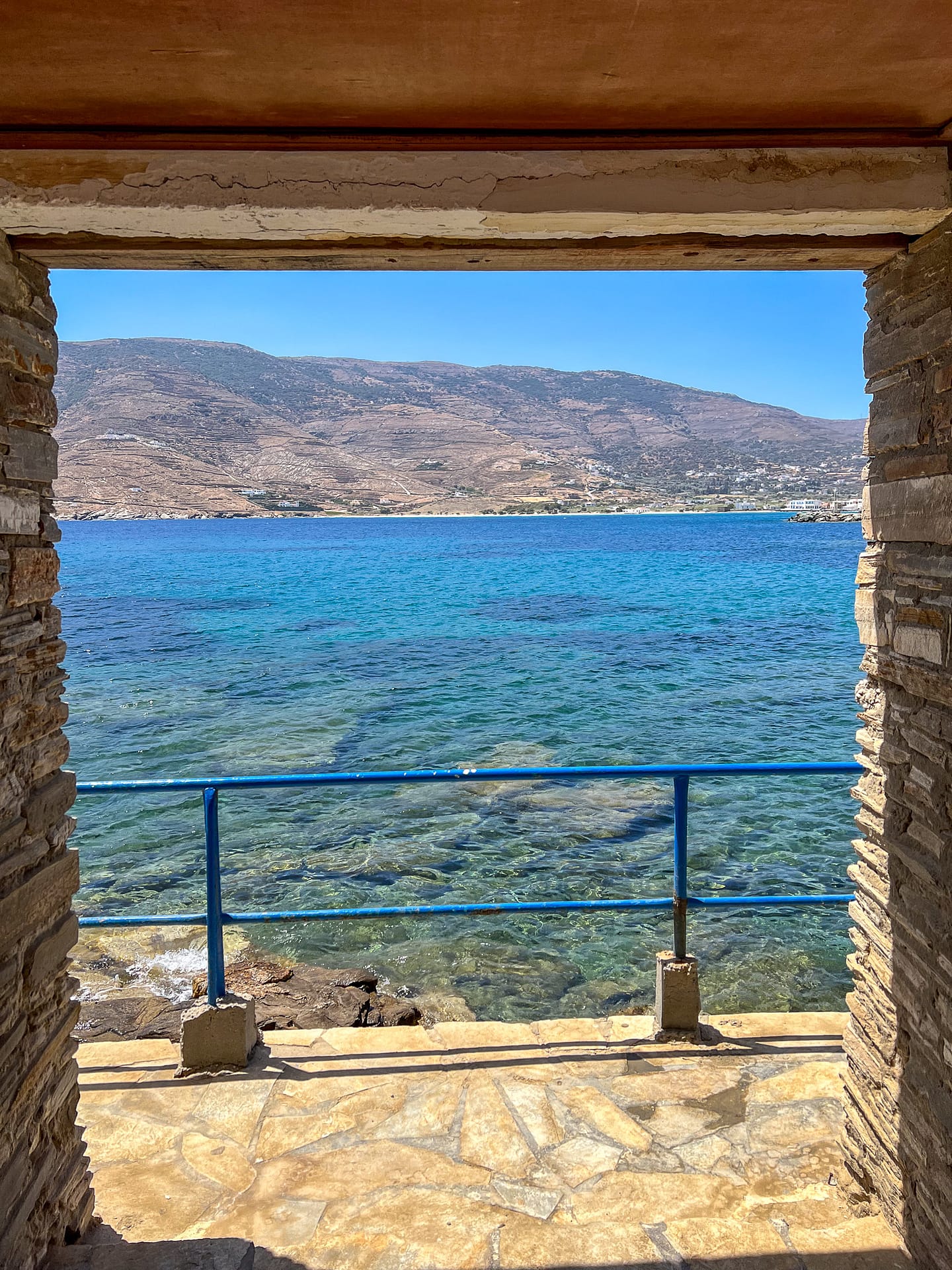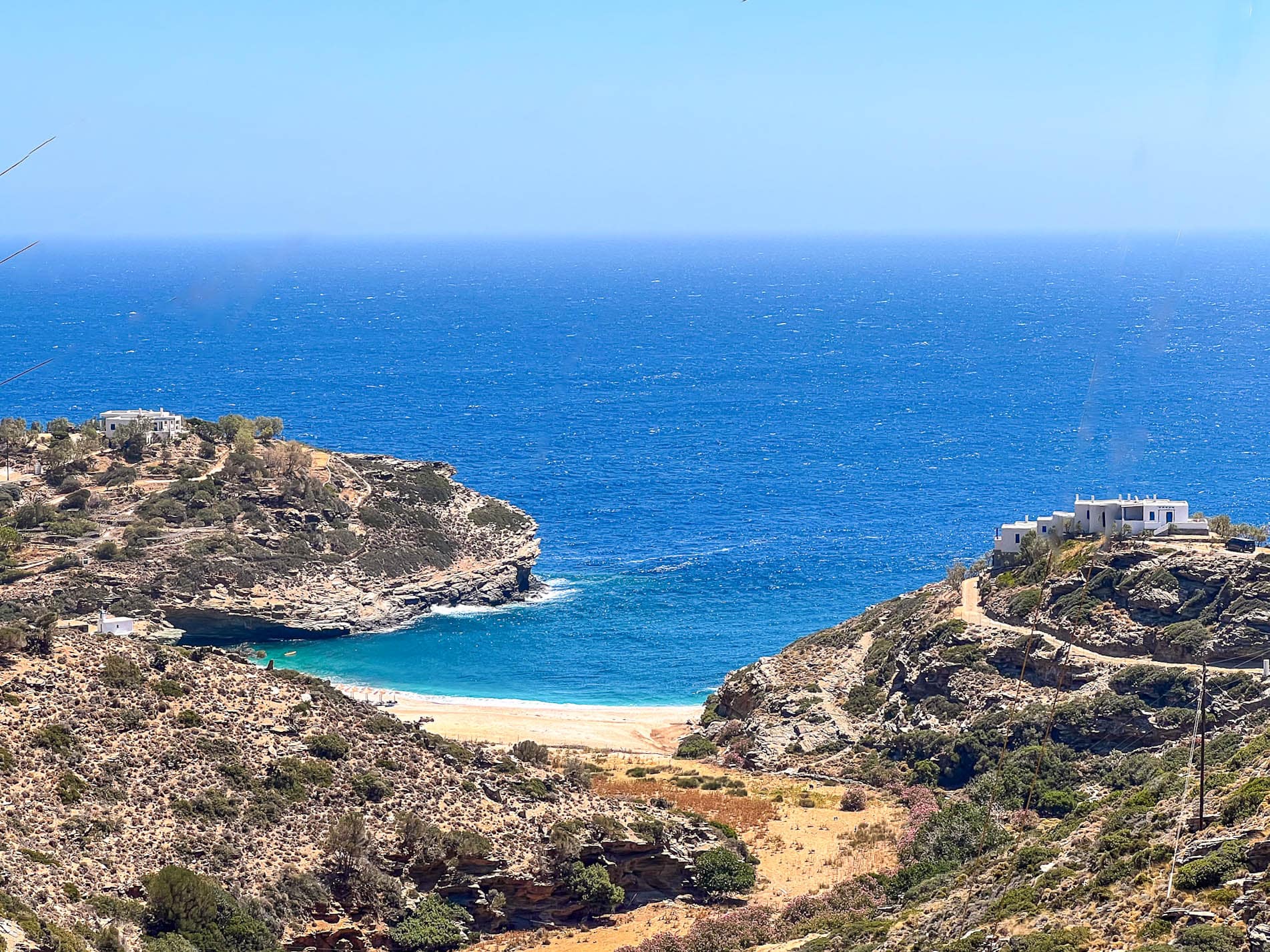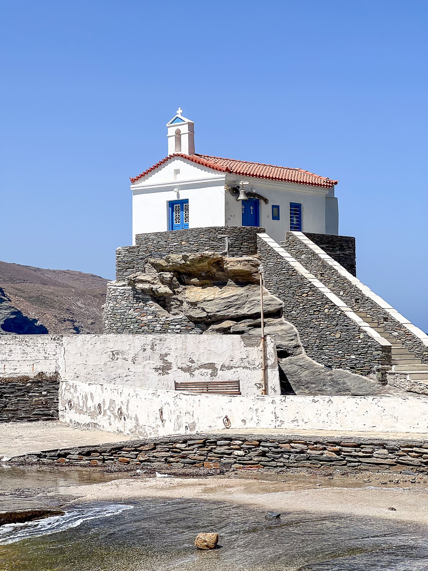 - dem Strand, den man oft auf Postkarten von Andros sieht. Er zeichnet sich durch eine hohe Felsformation im Meer aus. Eine schmale Schotterstraße führt zu den Klippen, direkt über dem Strand. Vielleicht siehst du ein paar Autos, die am Straßenrand geparkt sind. Du musst nicht sehr fit sein, um die 10-minütige Strecke hinab zum Strand und wieder hinaufzubewältigen. Der Strand ist klein, daher ist es besser, ihn unter der Woche zu besuchen. Da wir an einem Sonntag dort waren, war es ziemlich voll. Es gibt fast keinen Schatten und keine sanitären Einrichtungen, also denke daran, einen Sonnenschirm, Getränke und Snacks mitzubringen.