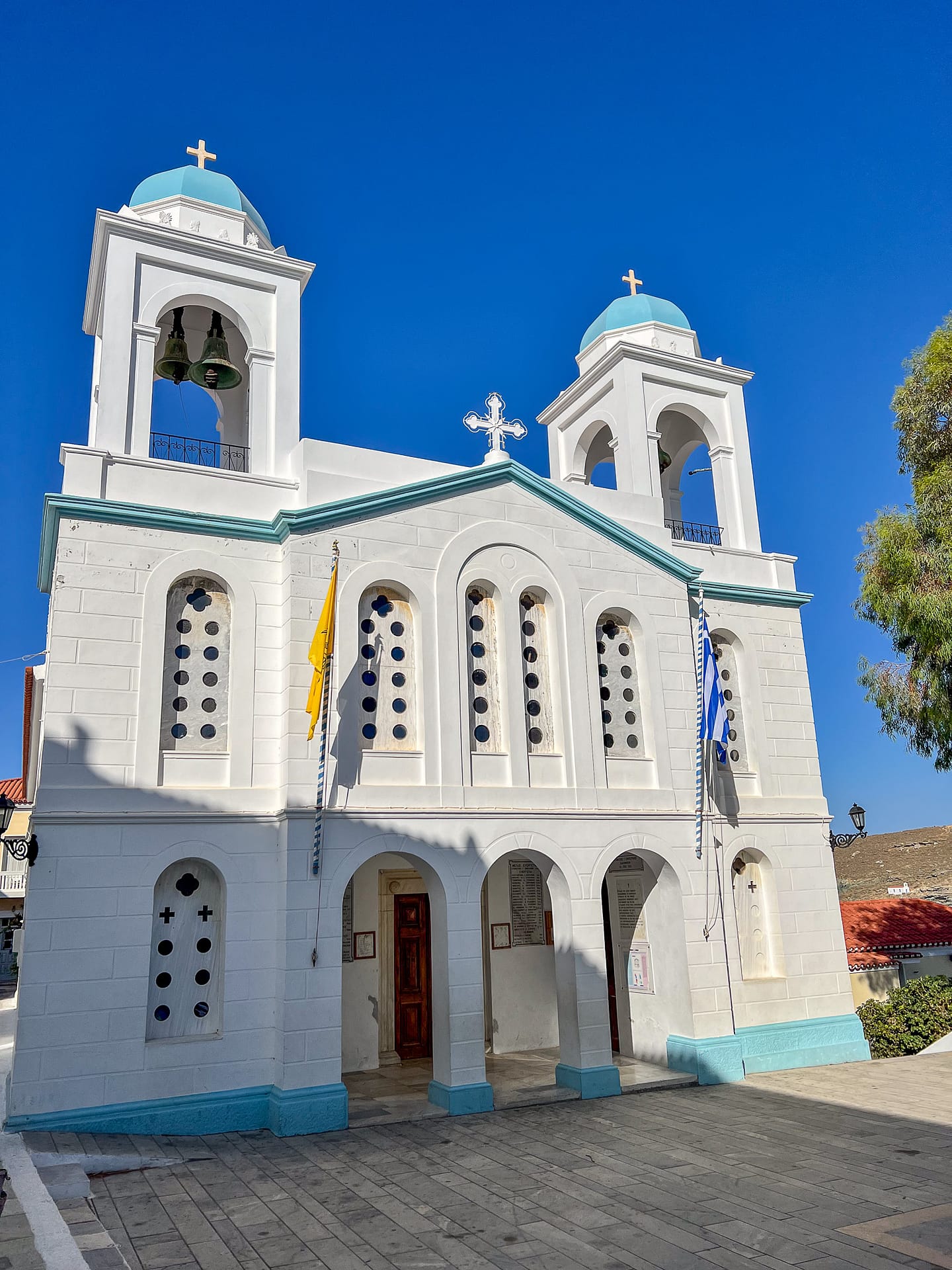 - Sie hat zwei Glockentürme und Agia Varara (kurz vor dem Riva-Platz) in der Altstadt von Chora.