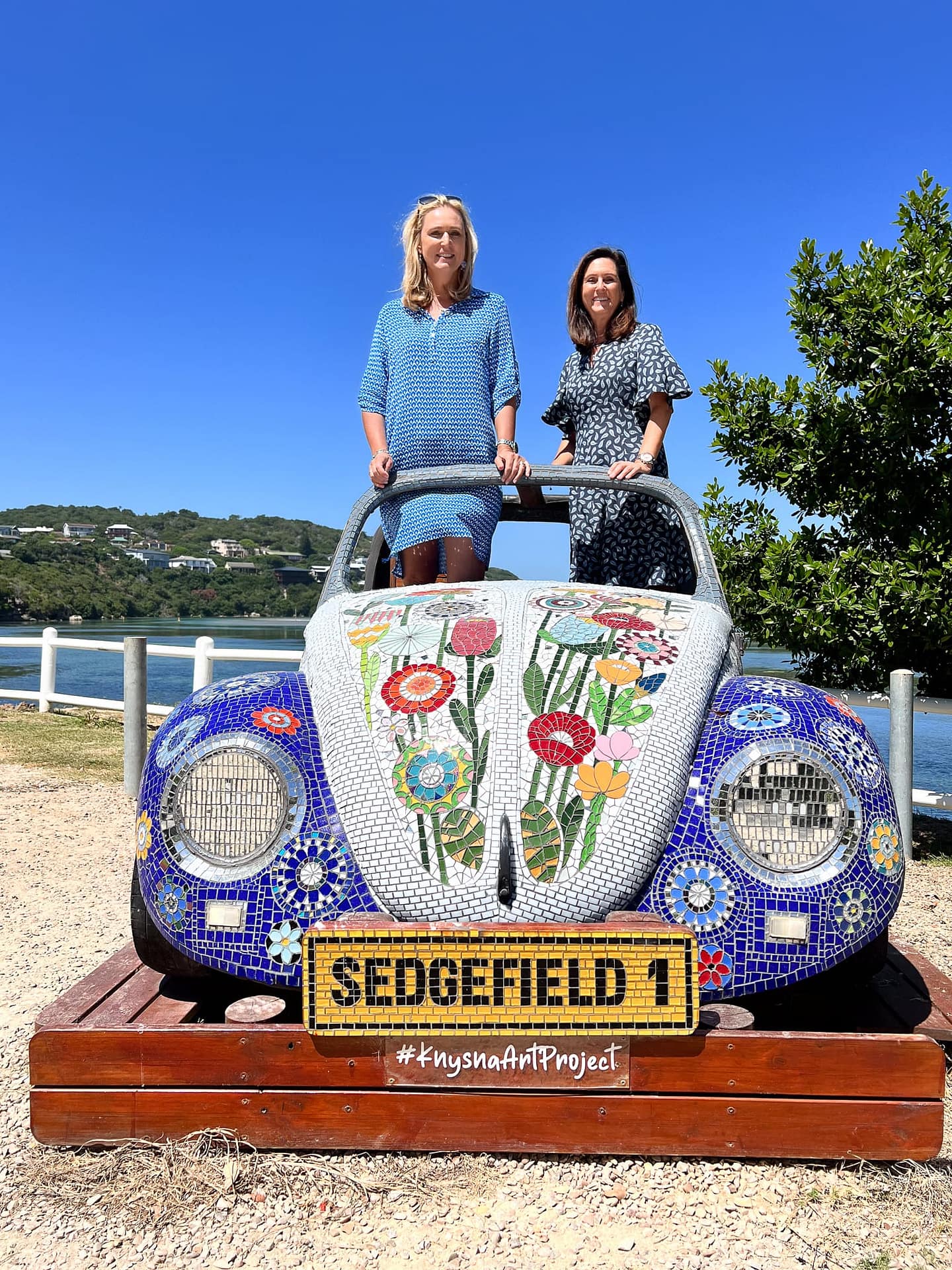 Just under 40 kilometres from George lies Sedgefield, which has been spared from massive tourism. Travelling along the N2 on the Garden Route, there seems to be little reason to stop, as unassuming shops, supermarkets, and petrol stations line the road. But the true magic of this place only becomes apparent when you drive through Sedgefield towards the sea. Here, a small paradise opens to visitors with breathtaking views over the lagoon and endless fine sandy beaches along the coast. Look out for many sculptures decorated with mosaics along the roads in Sedgefield (see our photo of us in a beach buggy).
