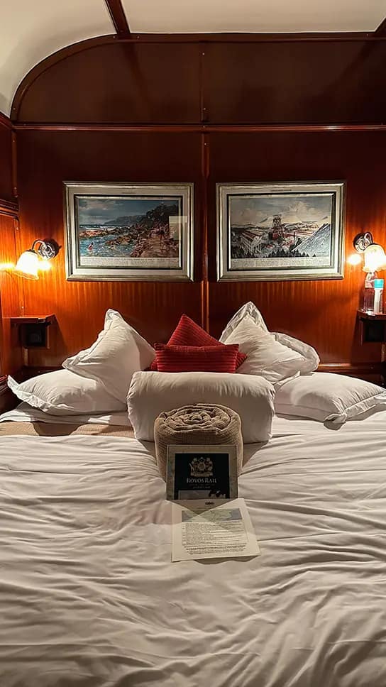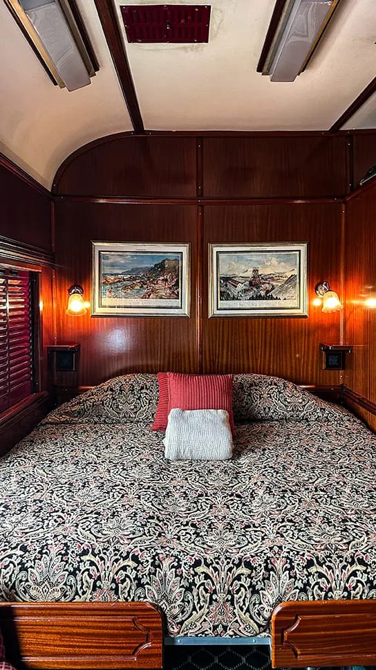 Rovos Rail’s deluxe suites blend old-world charm with modern comfort. The wood-panelled walls exude vintage luxury, while the soft lighting and plush bedding create a cosy atmosphere.