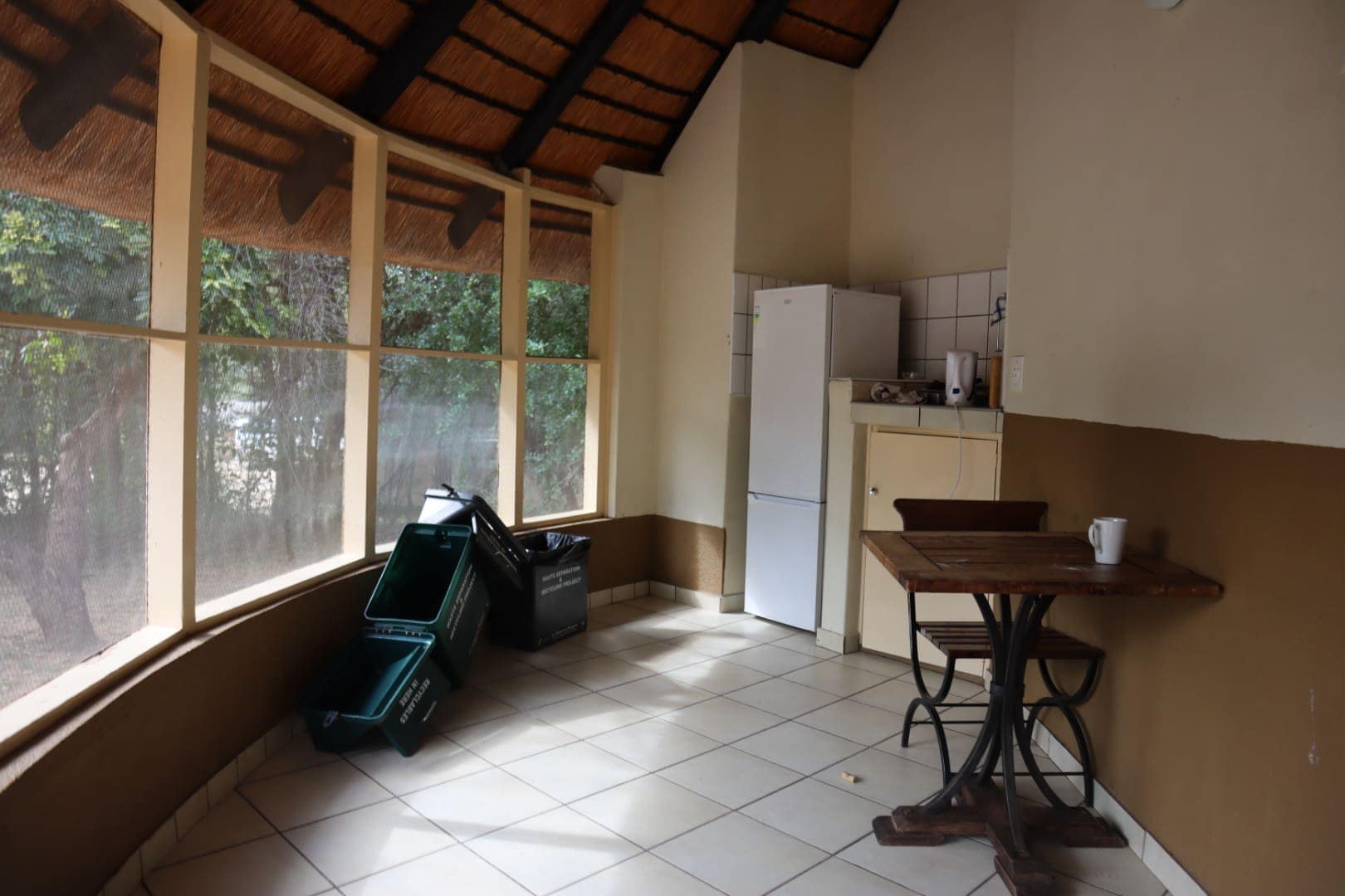 These units mostly come with an en-suite bathroom (only showers), single beds, an air conditioner, fridge, essential kitchen equipment and utensils such as a hotplate, sink, cutlery and plates. Some units are enclosed with mosquito wire patios (excellent for keeping monkeys and baboons out), while others are open.